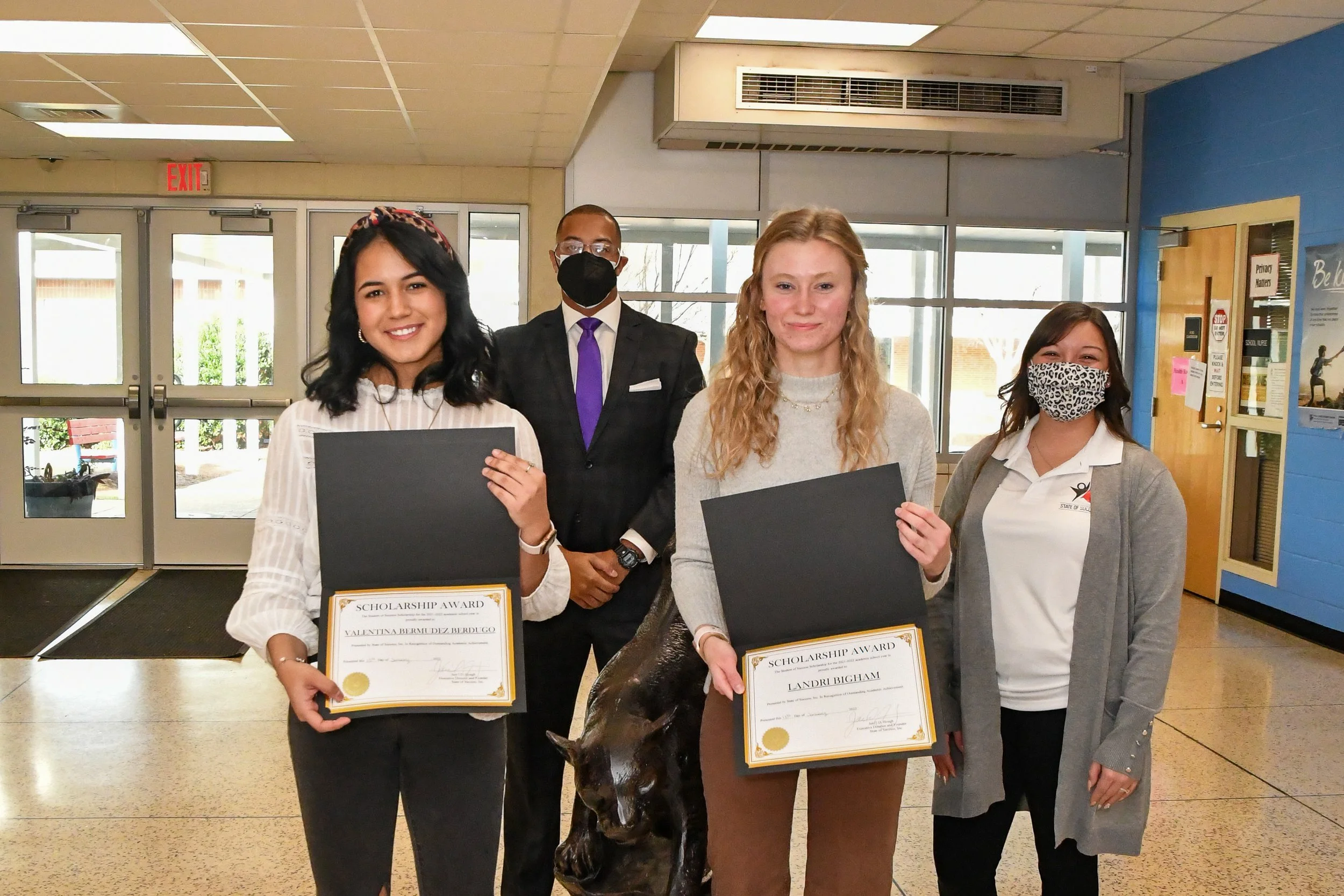 Jere’l D. Hough, Executive Director, State of Success, Inc. presents the 2022-2023 Student of Success Scholarship to the SOS East recipients, Anna-Brooke Taylor and Chandler Hill.